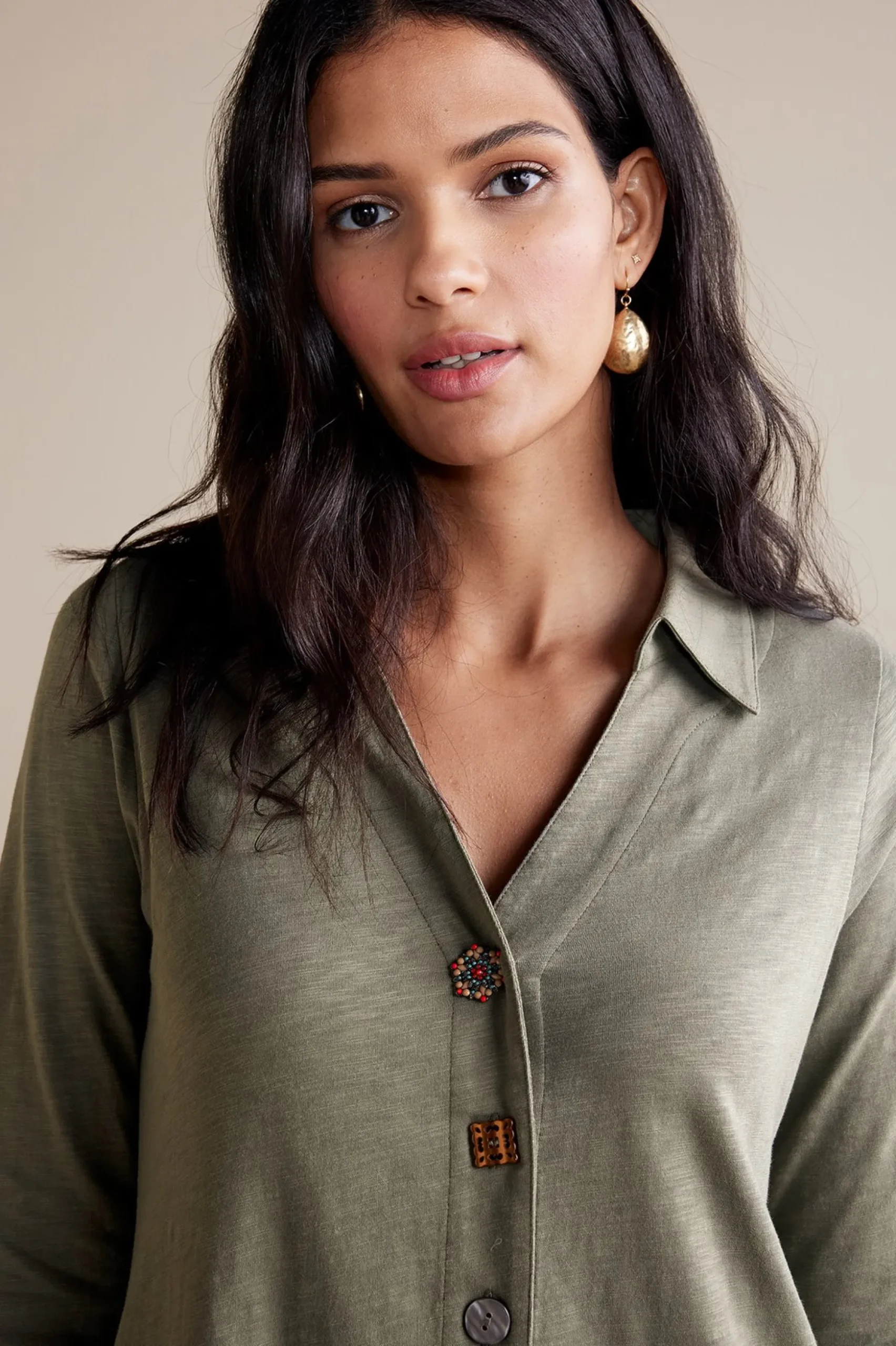 Eclectic buttons detail the front placket of this easy knit dress. With a collared, split V-neck, 3/4 sleeves, and a sharkbite hem, this effortless style is ready for sunny day strolls with sneakers or lunch and shopping in ballet flats.