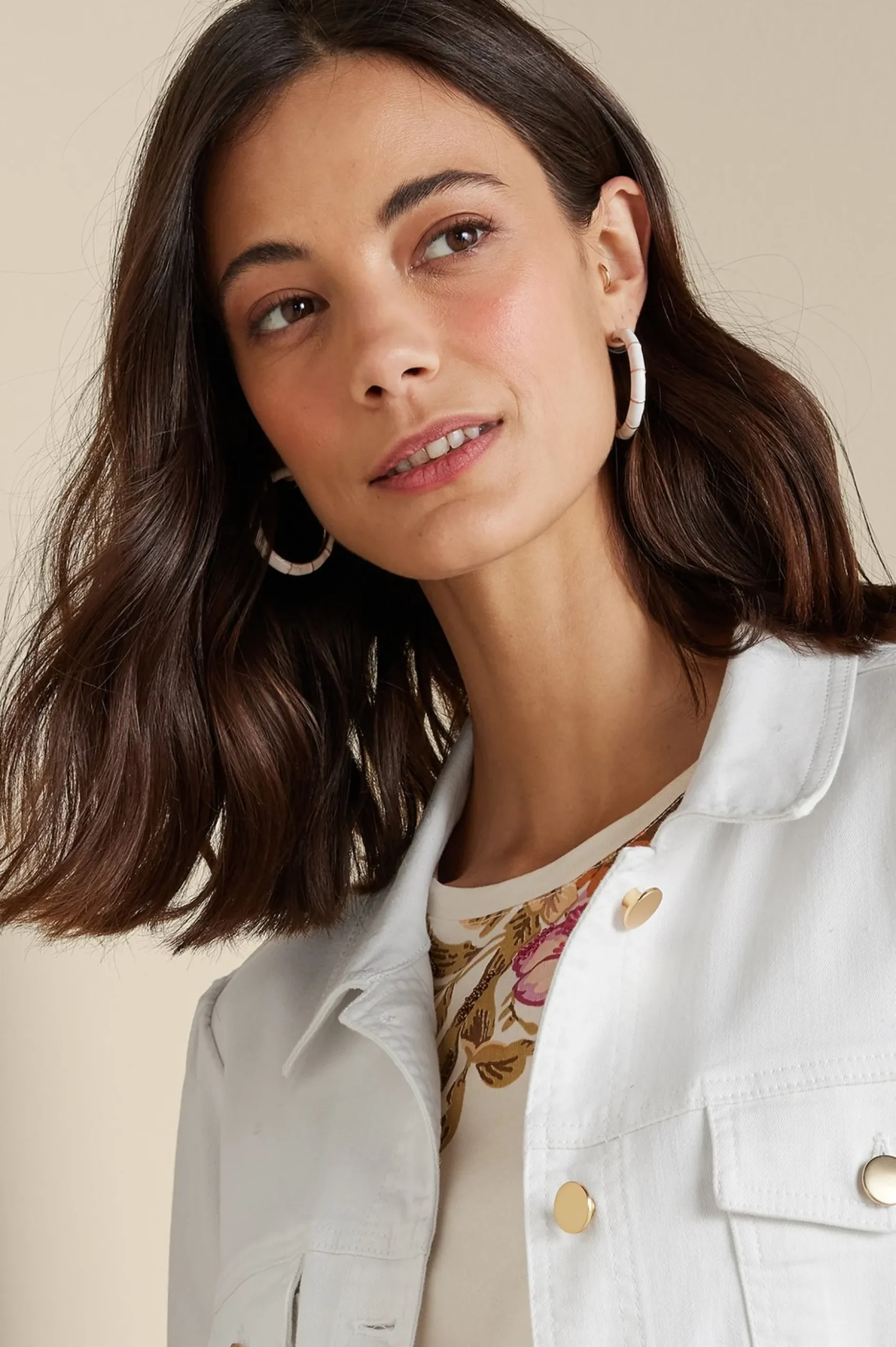 Your must-have hoops take a high shine to brilliant resin enamel coating on the base of this zinc/steel style. We love the pop of reflective color they bring to your spring looks. Post back.