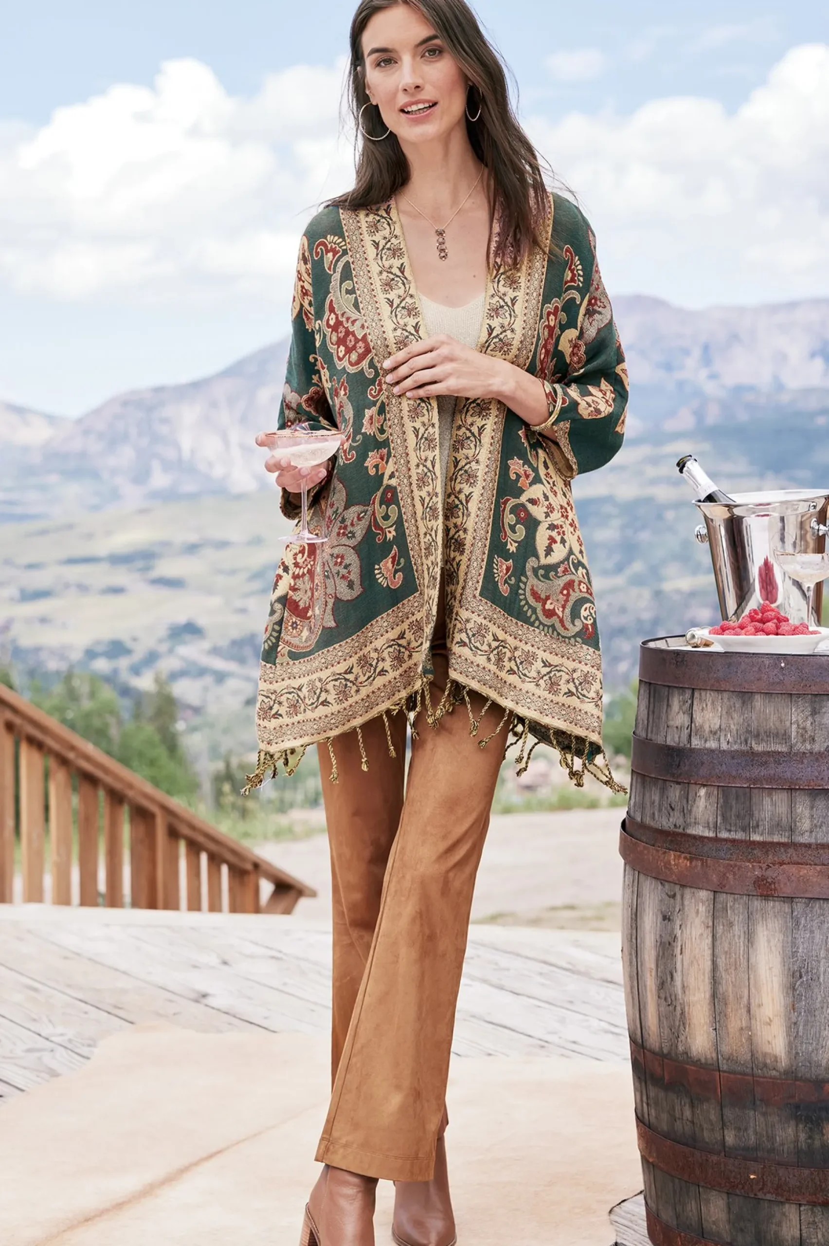 Channeling a carefree Santa Fe sensibility, this shimmering topper is an elegant four-season look. Dress it up for the holidays or pair it with jeans in the warmer months. With a refined hand, the cotton blend jacquard is soft and lightweight in emerald green topped with claret, rose, and sand paisleys. The lightest golden sparkle is woven throughout for a subtle sheen. This relaxed style is finished with a braided tassel hem and easy, 3/4 dolman sleeves.