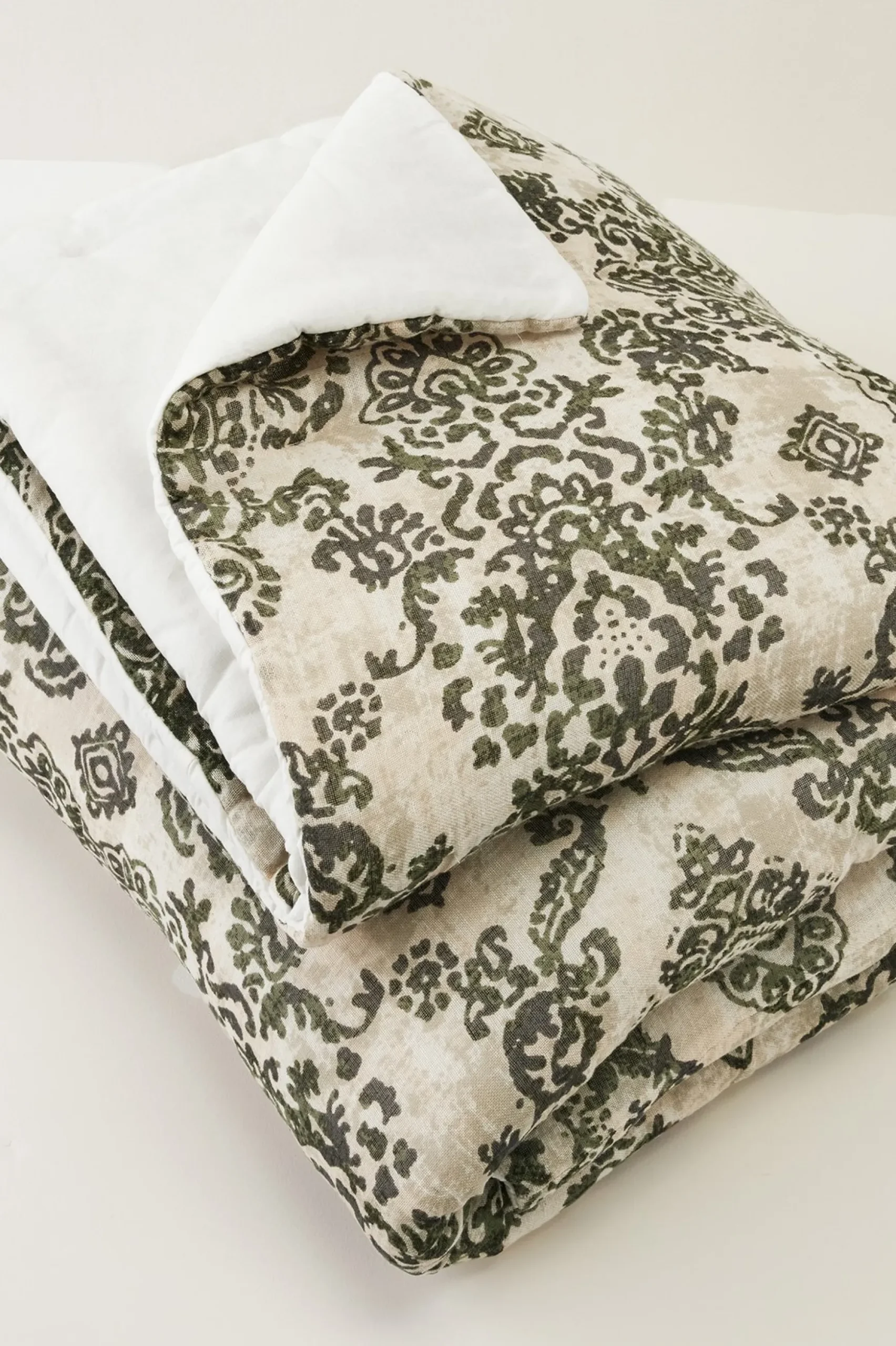 Green scrollwork atop a soothing sea of oatmeal evokes a peaceful garden in the English countryside. But this dreamy design is more than just beautiful. Crafted of soft linen and cotton, this lush comforter will ease you into a restful night’s sleep.