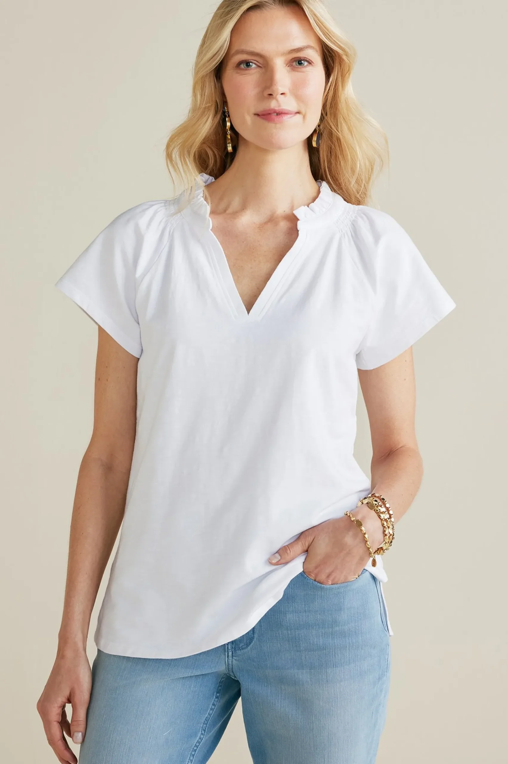 A warm weather essential with extra style, this tee is made from our super-soft SUPIMA® cotton slub fabric for all-day ease. Raglan extended cap sleeves with smocked shoulders, a banded collar, and a split placket lend this casual look delightful detail.