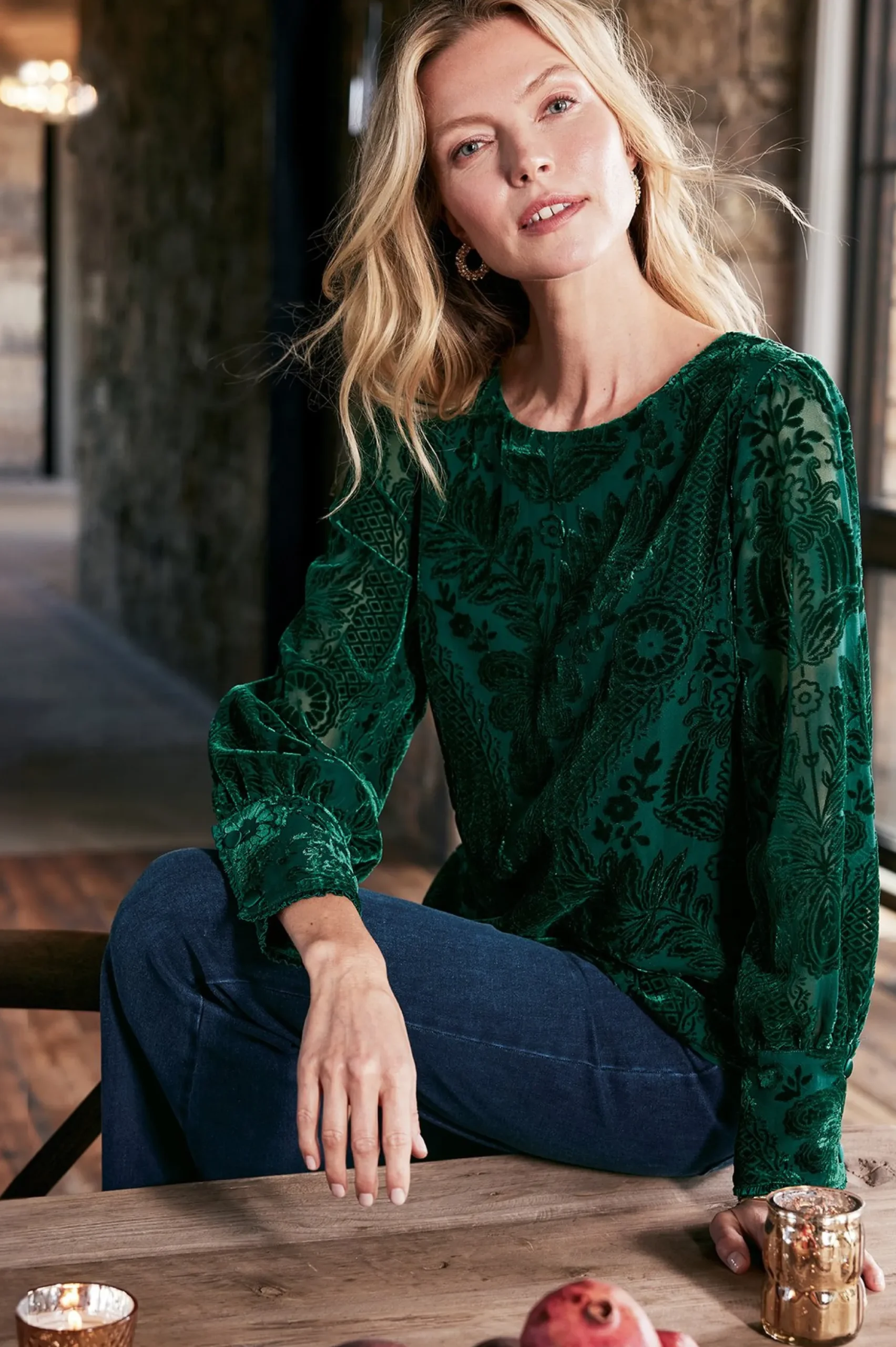 The burnout velvet detail is gorgeous. The jewel green hue is to die for. This floral top is altogether feminine and chic, simply magical for the holidays and beyond. Deep statement cuffs on the sheer, billowy sleeves are fastened with covered buttons. Lined body, keyhole back closure.