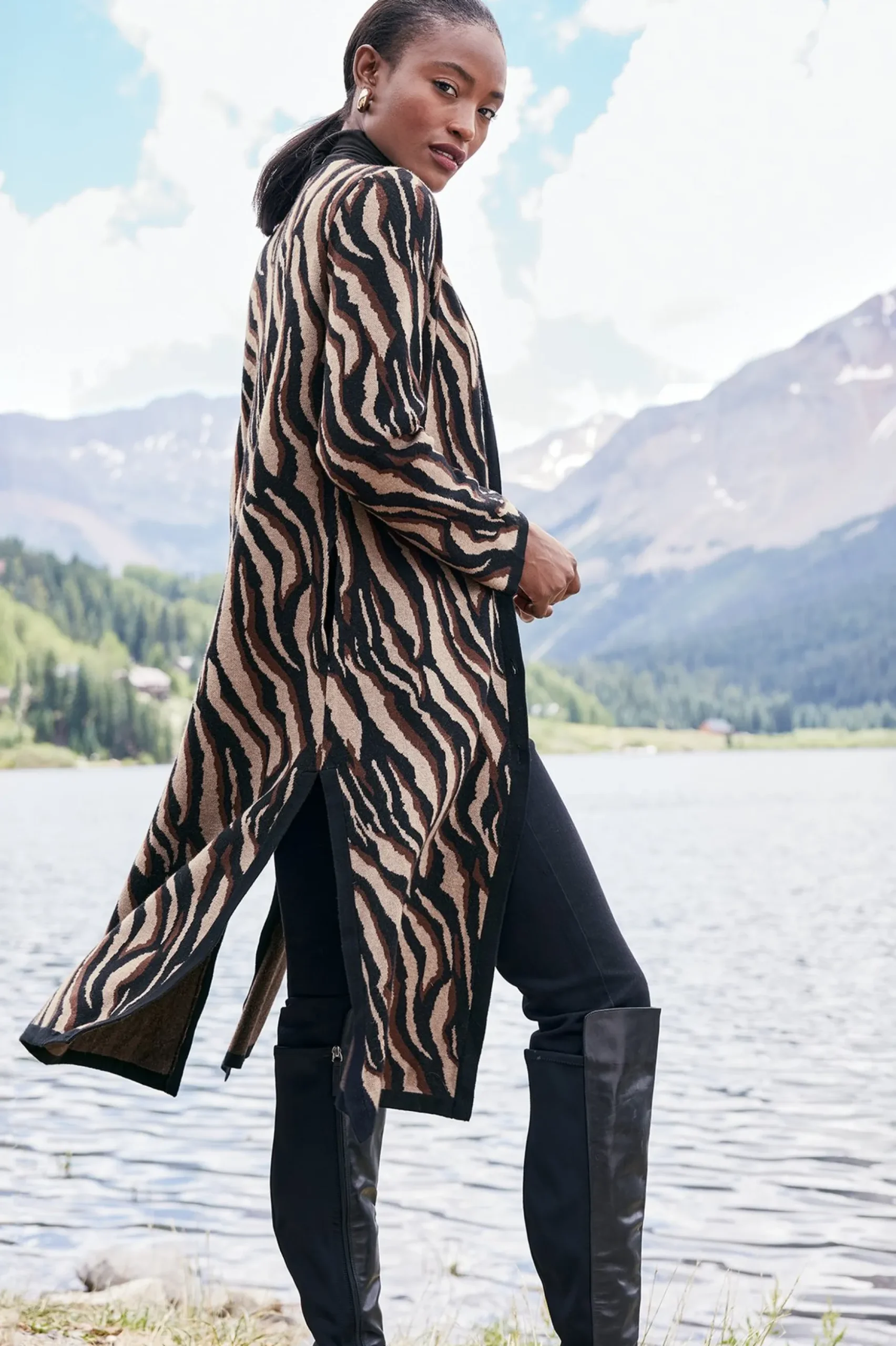 With a refined weave and super-soft knit, this longline cardi heeds the call of the styled in a fresh, neutral zebra jacquard. On-seam pockets keep it functional, while high side slits feel ultra-chic. Button front.