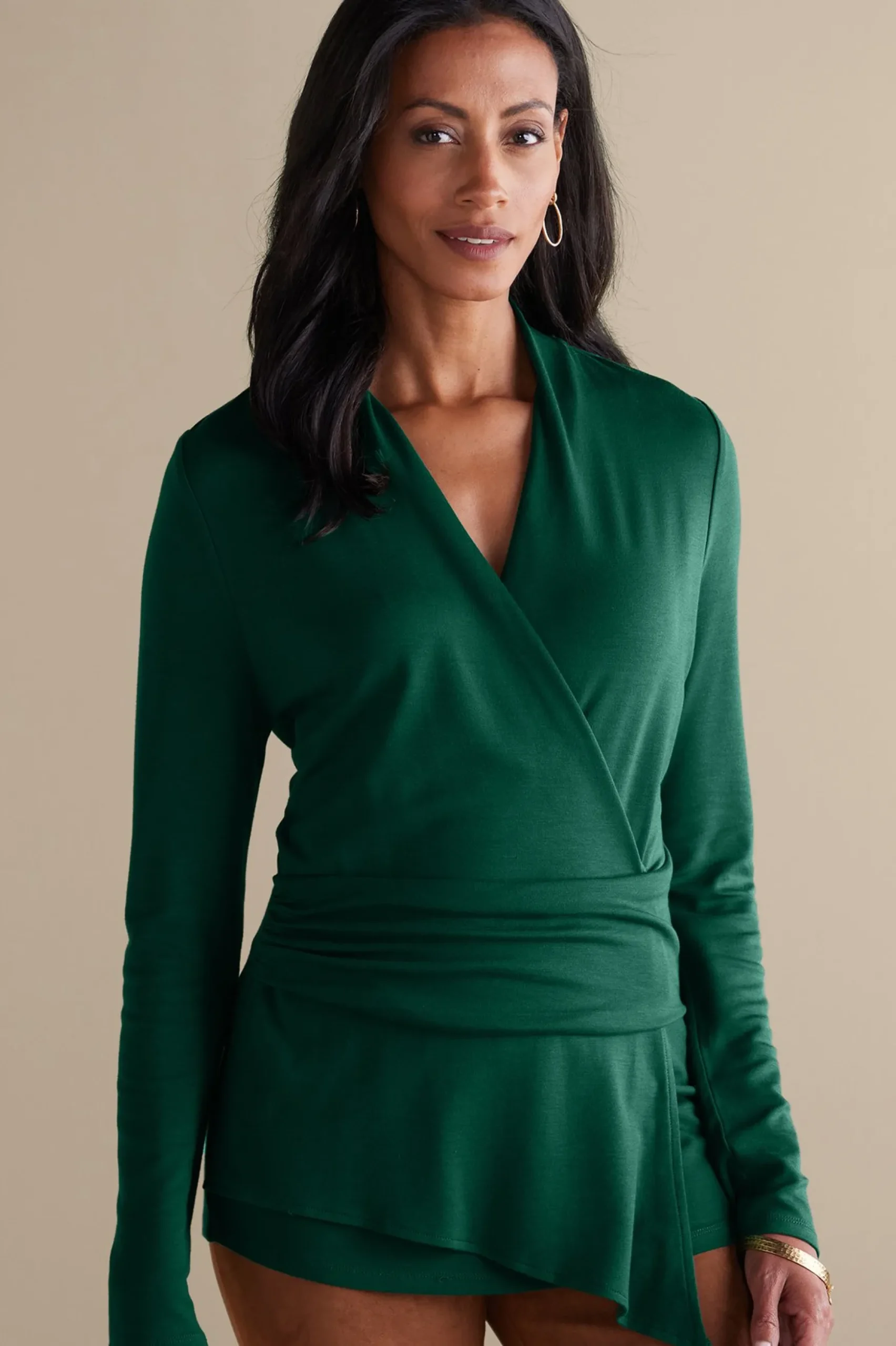 A new twist on the wrap top finds soft stretch layers in vibrant jewel green crisscrossing into shapely, waist-defining territory. The surplice neckline with an asymmetrical front overwrap is so flattering. Long sleeves.