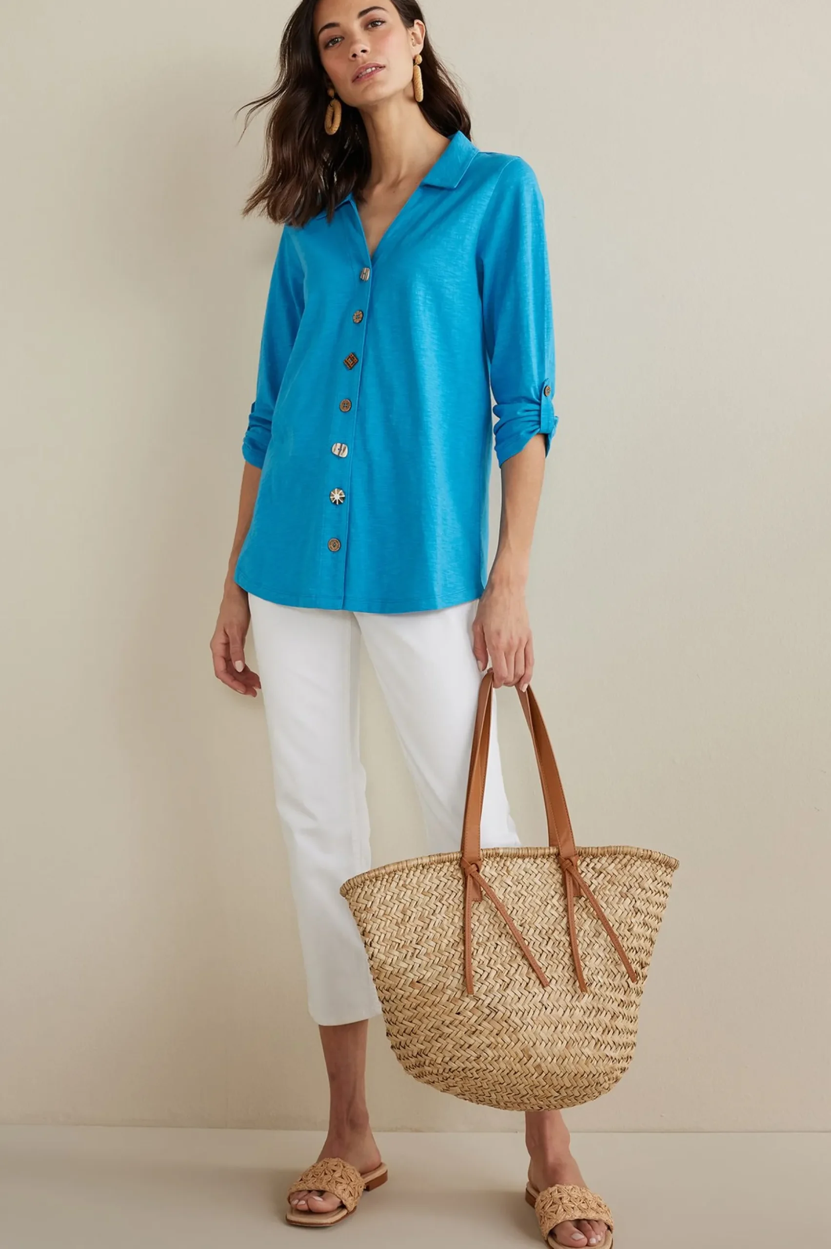 Danielle is back and better than ever with an updated silhouette and, of course, the whimsical mix of eclectic buttons on the front placket. It starts with a quality, weighty cotton that feels great. A roll-tab on the 3/4 sleeves allows for effortless cuffing. The curved hem is fresh and easy.