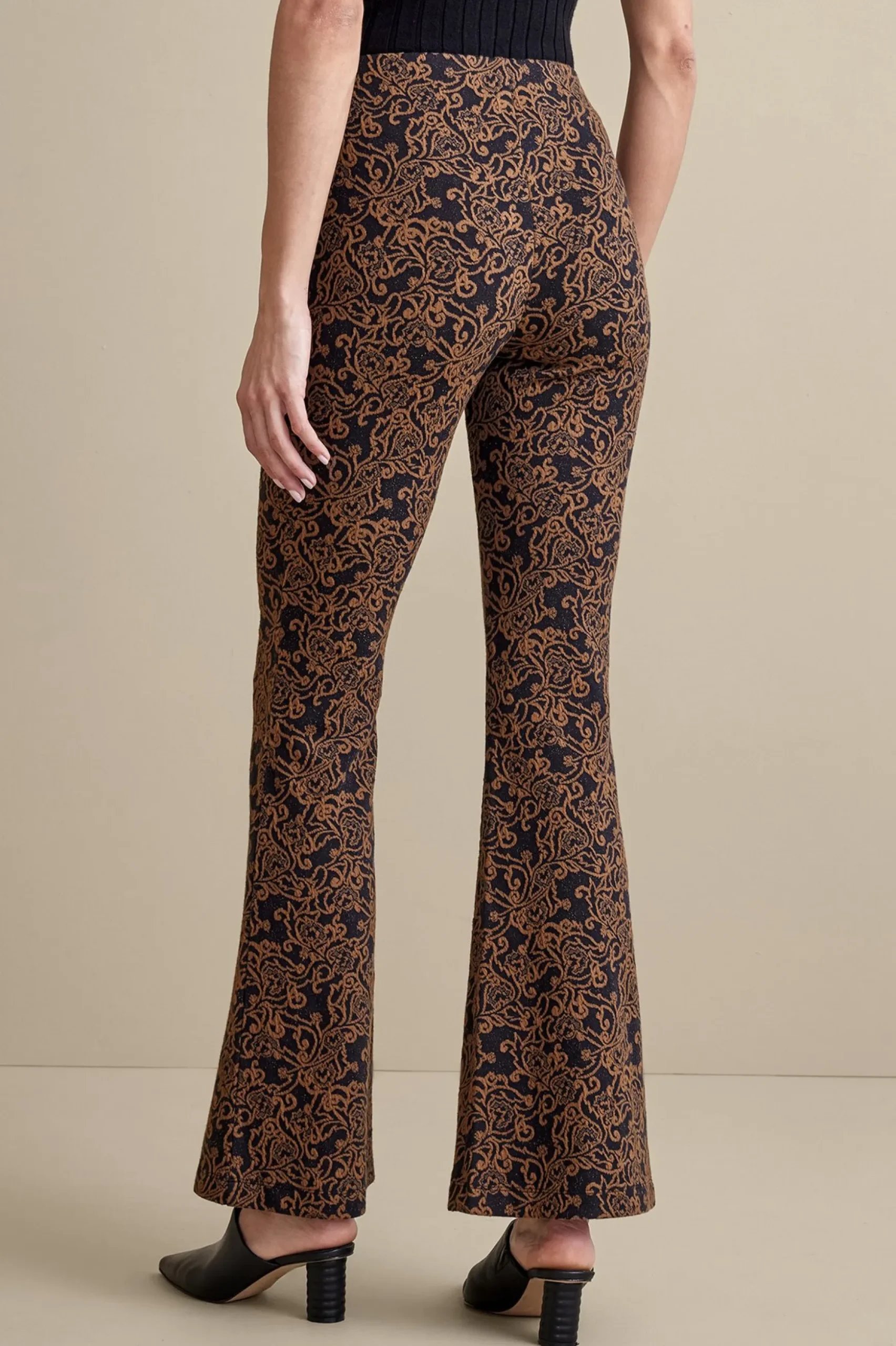 This pant will take center stage in any fall outfit with a fabulous jacquard print in a fashion-forward flared silhouette. The elastic waistband sits at the natural waist for a slimming, comfortable fit. Pair with a blouse or sweater and finish the look with mules or booties. Misses inseam 30″.