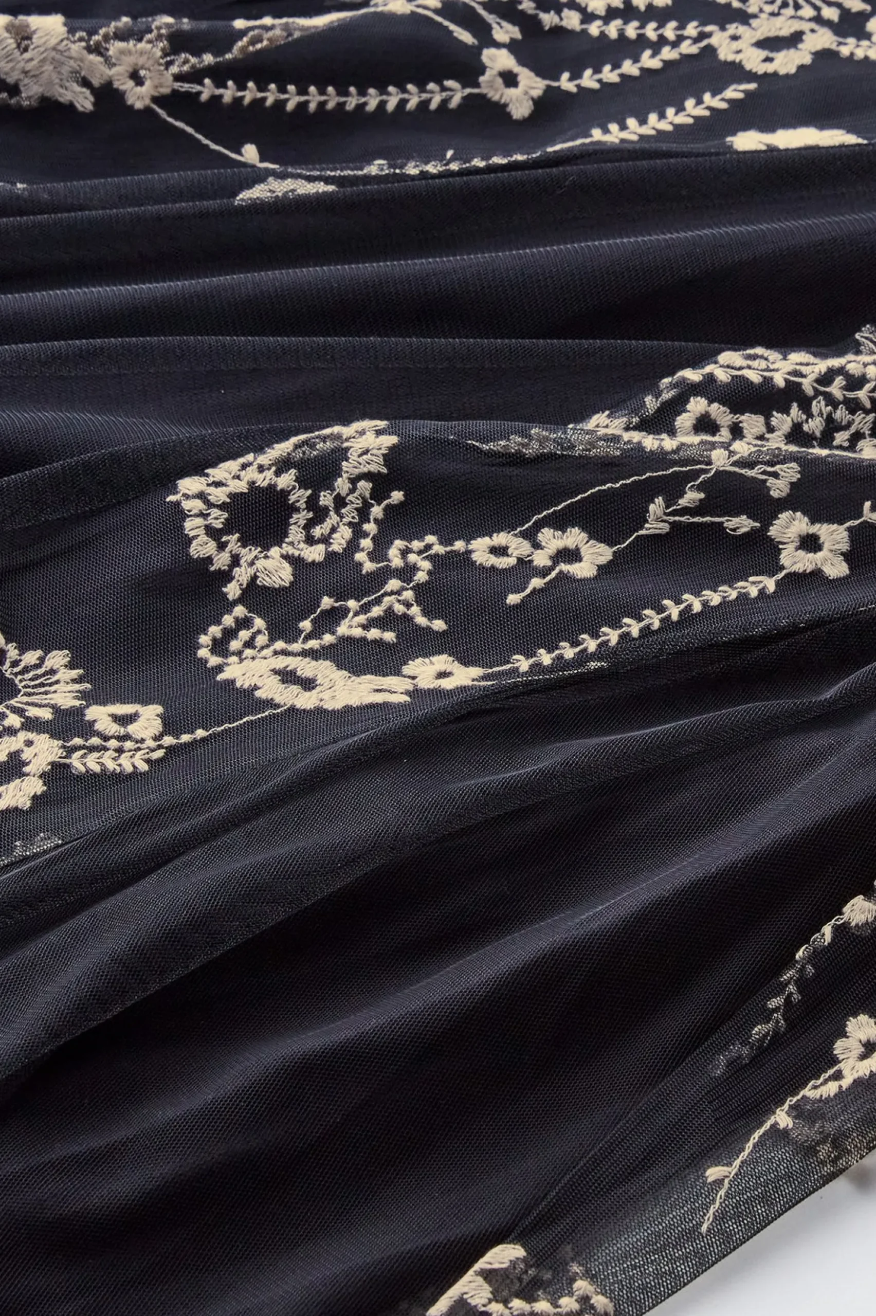 Intricate floral embroidery adorns this flowy maxi skirt with a flared silhouette. Fully lined, it features a flat front and elastic back for a comfortable fit. Side seam zipper.